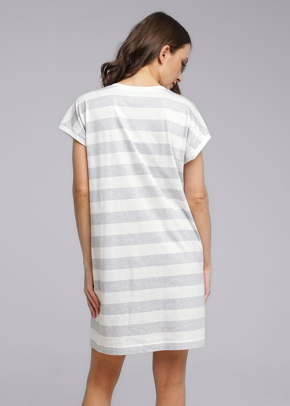 Платье для дома прямого силуэта из хлопкового трикотажного полотна. Цельнокроеный рукав, по низу рукава притачной манжет и нашивка. Округлая горловина с обтачкой. Карманы в боковом шве. По переду принт.