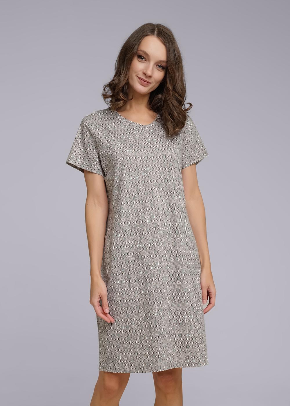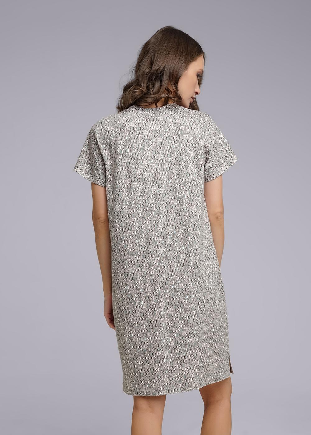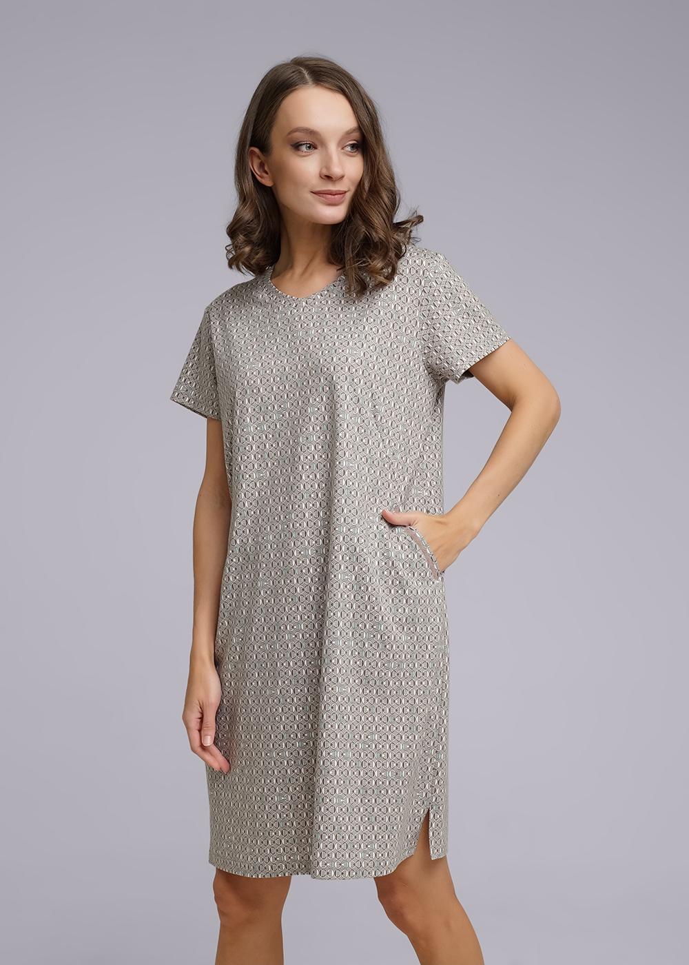 Платье для дома из хлопкового трикотажного полотна. Короткий втачной рукав. V-образный вырез горловины. На детали переда вытачки из бокового шва с карманами в листочку. Карманы декорированы узким кружевом. По бокам разрезы.