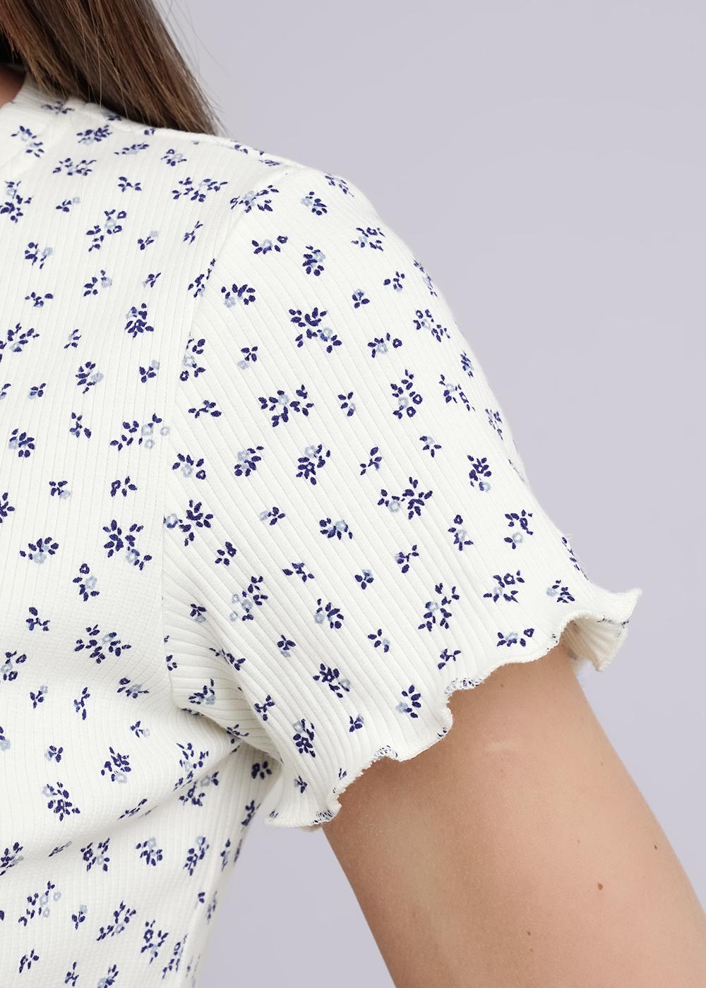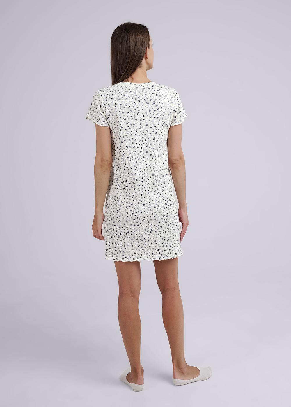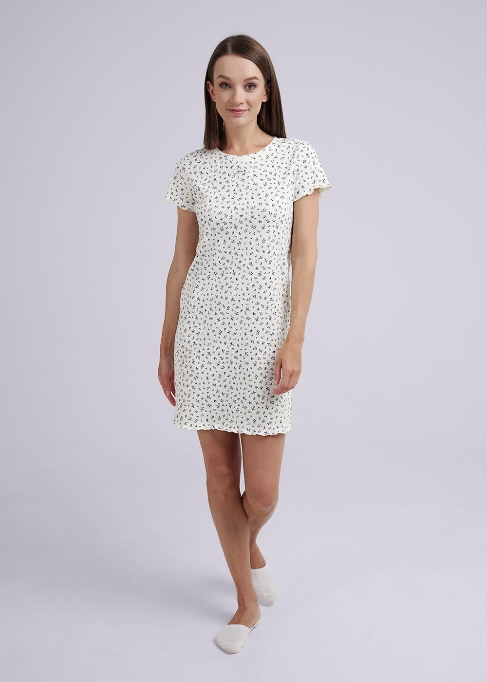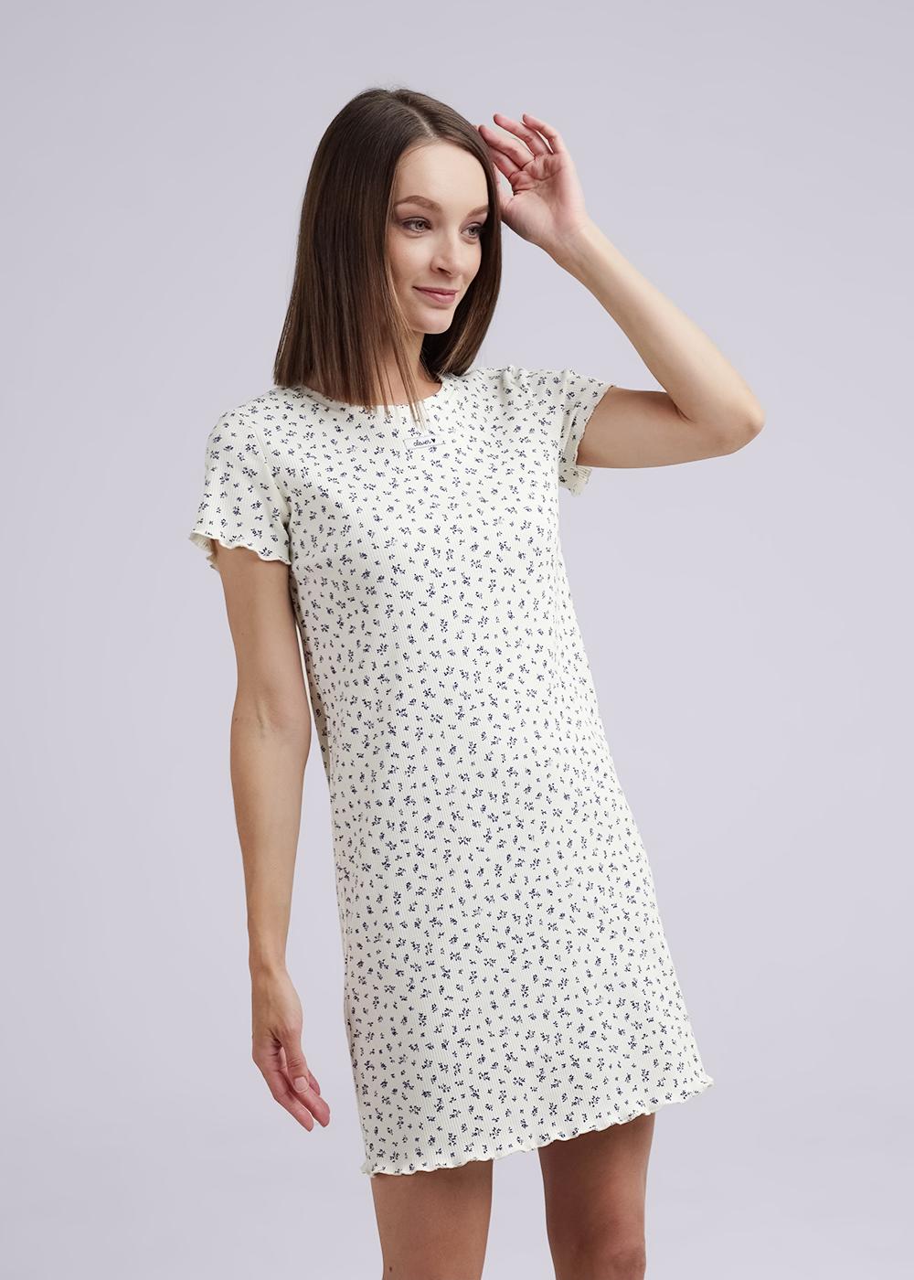 Платье для дома из хлопкового трикотажного полотна с эластаном - кашкорсе, длиной до колена. Втачной короткий рукав. Округлая горловина с обтачкой. Низ рукава и изделия имеет волнистый край (мелкий оверлок). По переду нашивка.