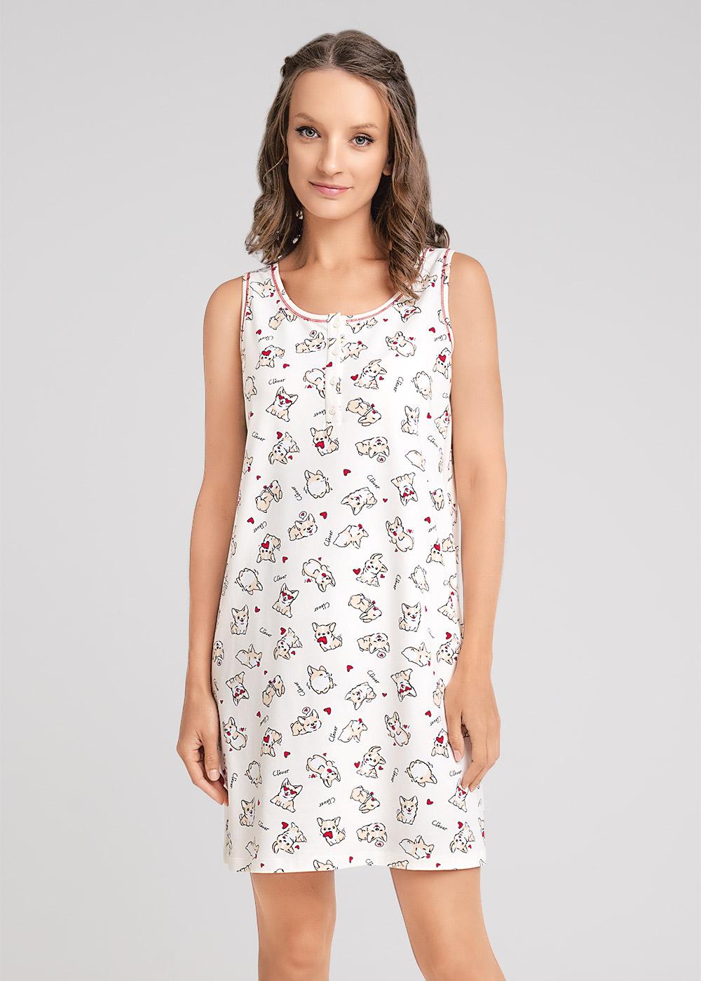 Сорочка ночная для дома из хлопкового трикотажного полотна с добавлением эластана. Широкая бретель. Круглая форма горловины. По переду функциональная планка с застежкой на пуговицы. По горловине и пройме контрастный застил.