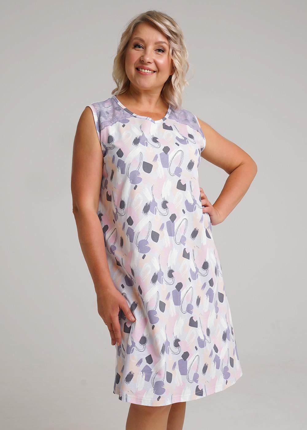 Сорочка ночная для дома без рукава из хлопкового трикотажного полотна. V-образный вырез горловины декорирован металлической нашивкой. Кокетки по переду дублируются кружевный полотном.