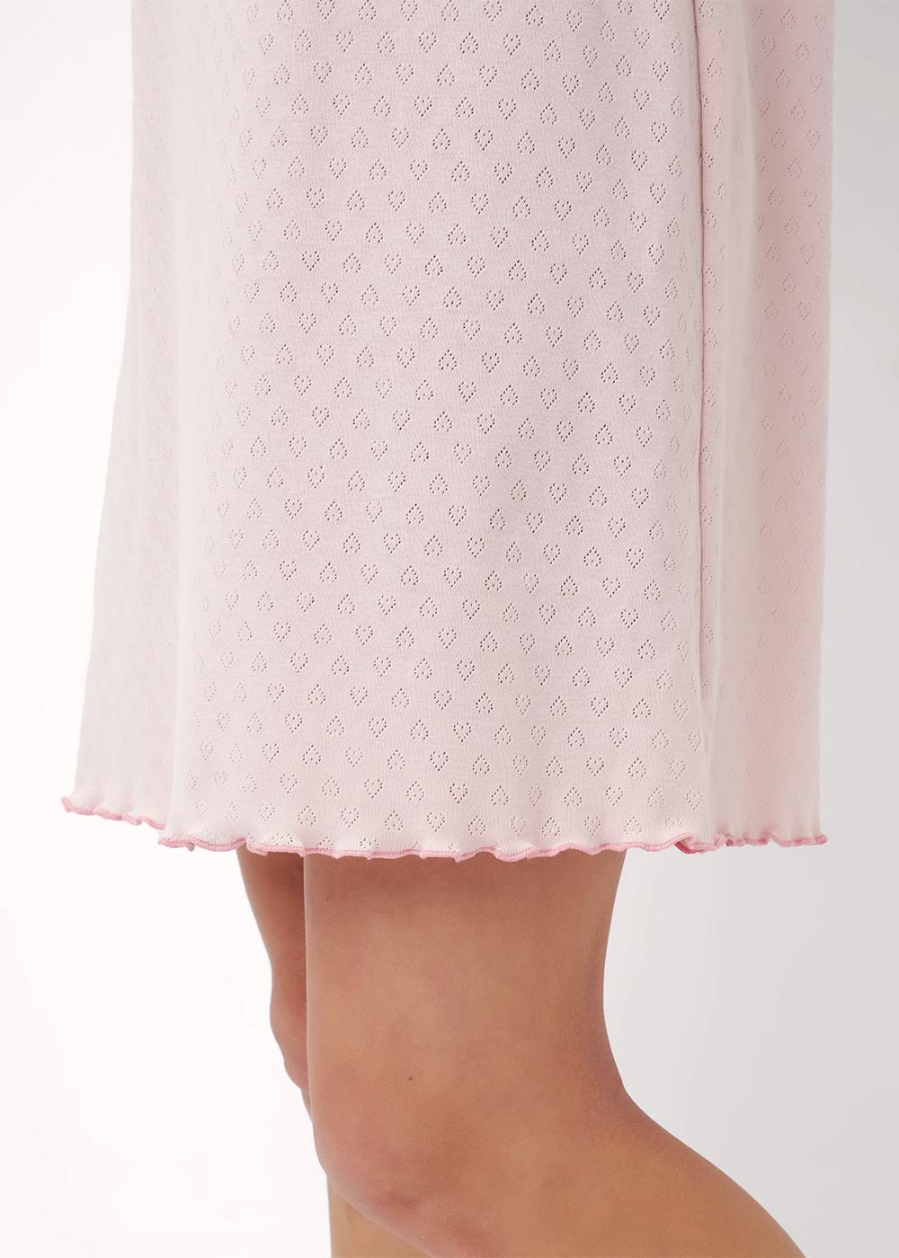 Ночная сорочка А-образного силуэта, из трикотажного полотна рибана ажур.На узких бретелях с регулировкой.По пройме окантовка. По горловине переда ажурная резинка, по центру лифа сборка на резинку,бант.По спинке средний шов.По низу изделия мелкий оверлок.