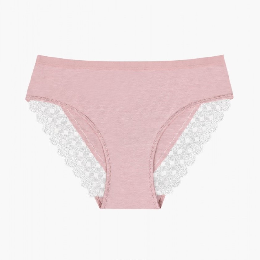 Трусы-слипы из модала и хлопка, розового цвета, с кружевными вставками и обрамлением, средней посадки, на мягкой резинке.