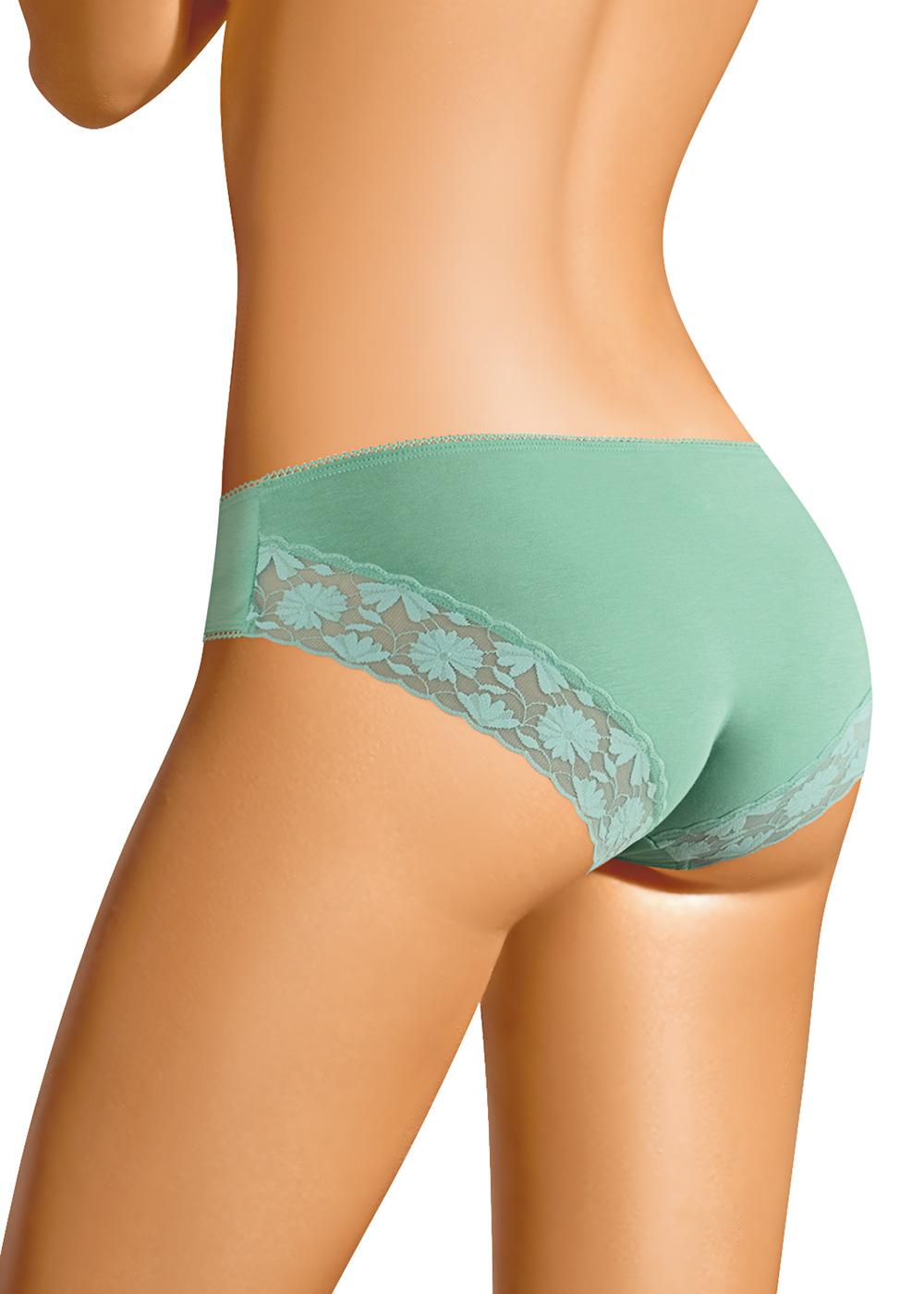 Трусы бикини комфотной посадки из хлопкового полотна с добавлением эластана. По талии и ножке ажурная резинка. По спинке кружево. Завершает дизайн бантик.