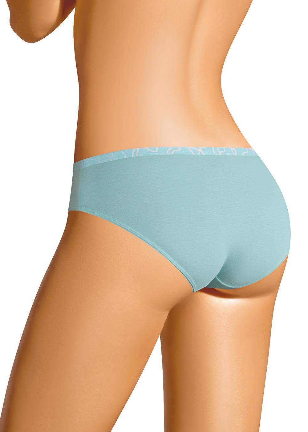 Трусы бикини комфортной посадки из хлопкового полотна с добавлением эластана. По талии окантовочная резинка. По ножке резинка кантом. Завершает дизайн принт и жаккардовая нашивка на поясе.
