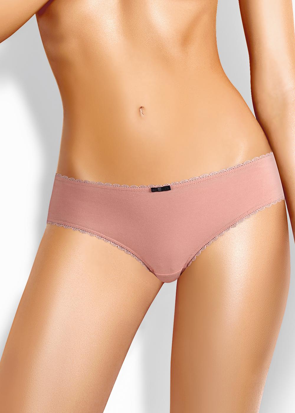Трусы-бикини женские из эластичного хлопкового полотна. Обработка краев - ажурная резинка с фестоном. Со стороны спинки по ножке - кружево. По переду атласный бант.