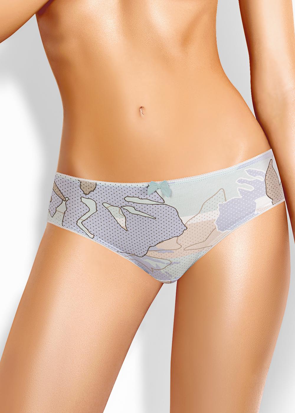 Трусы-бикини женские из эластичного хлопкового полотна. Обработка краев - ажурная резинка с фестоном. По переду бант.