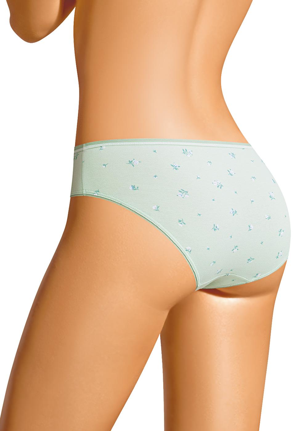 Трусы бикини женские из эластичного хлопкового полотна. Обработка краев по талии - окантовочная резинка с застилом, по ноге - полуокантовка.