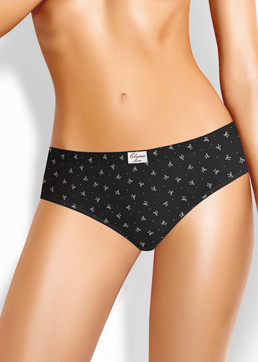 Трусы бикини женские из эластичного хлопкового полотна. Обработка краев по талии - широкая внутренняя резинка, по ноге - полуокантовка. По переду жаккардовая нашивка.