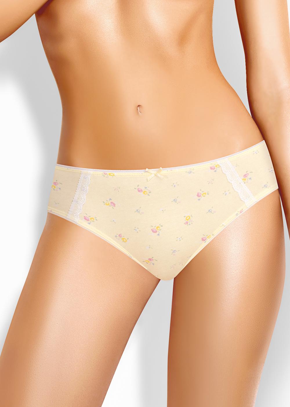 Трусы бикини женские из эластичного хлопкового полотна. Обработка краев по талии и ноге - резинка с кантом. По переду вставки из узкого кружева, атласный бант.