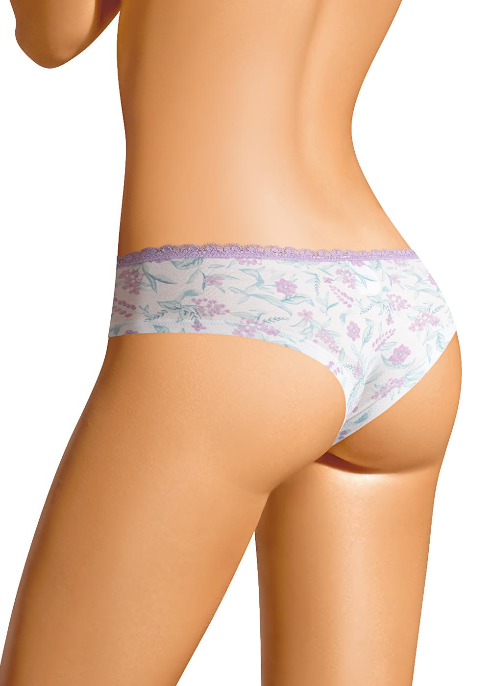 Трусы-бразилиана женские из эластичного хлопкового полотна. Обработка краев по талии - узкое кружево, по ноге - подгибка. По переду бант.