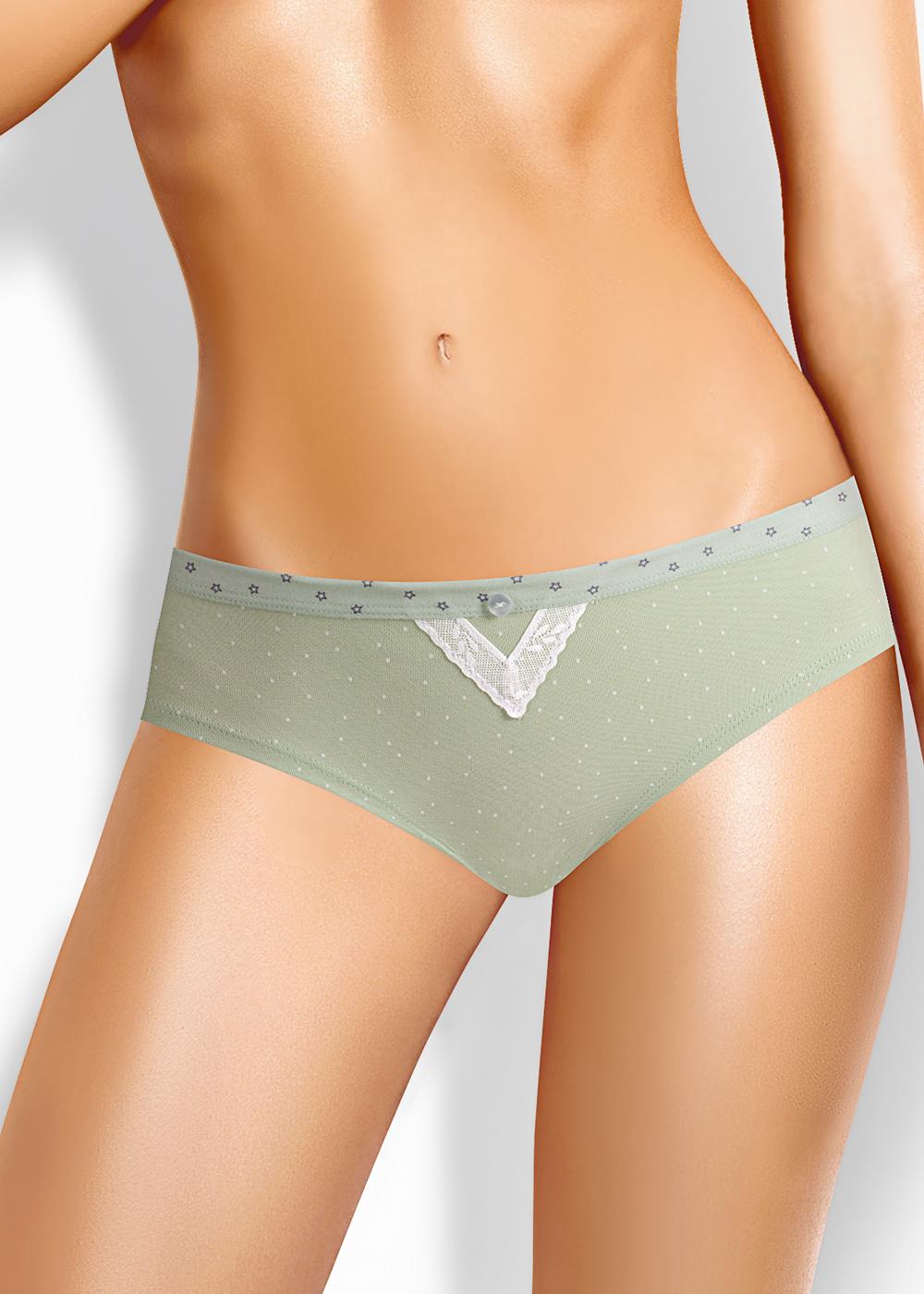Трусы бразилиана женские из эластичного хлопкового полотна. Обработка краев по талии - окантовочная резинка, по ноге - подгибка. По переду кружевная вставка,пуговица.