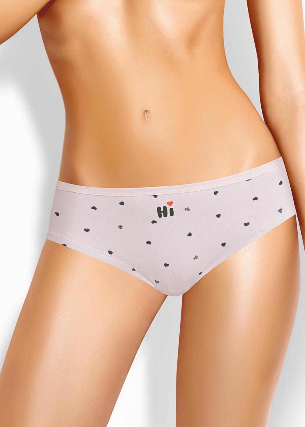 Трусы бразилиана женские из эластичного хлопкового полотна. Обработка краев по талии - окантовка, по ноге - подгибка. По переду принт.