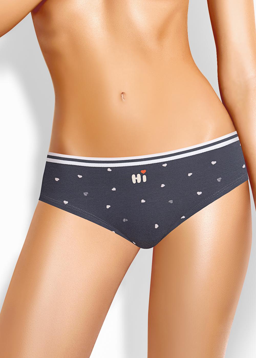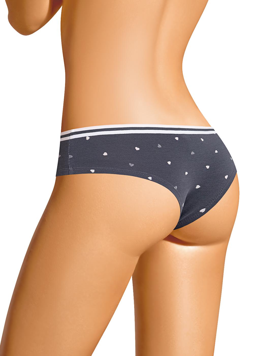 Трусы бразилиана женские из эластичного хлопкового полотна. Обработка краев по талии - жаккардовая резинка, по ноге - подгибка. По переду принт.