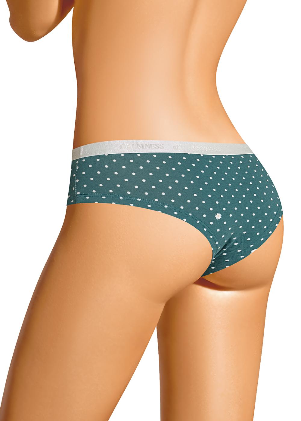 Трусы - бразилиана женские из эластичного хлопкового полотна. Обработка краев по талии жаккардовая резинка, по ноге - подгибка.