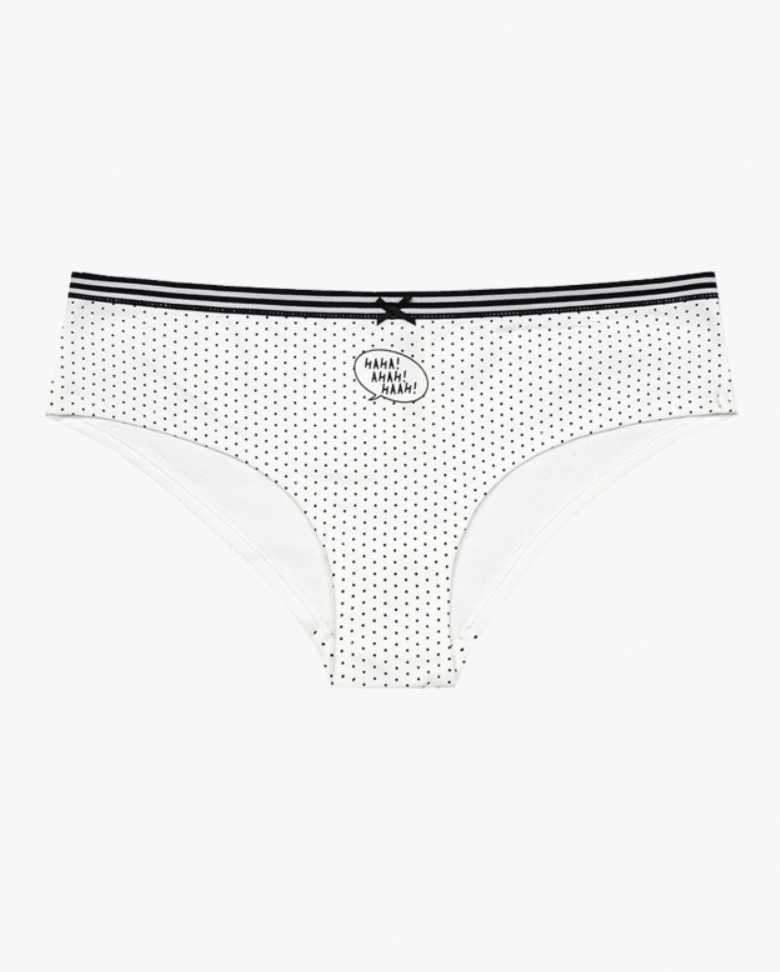 Женские трусы от торговой марки Индефини. Трусы-шорты из хлопка, белого цвета, с принтом в горошек и с принтом-надписями спереди, на мягкой резинке.