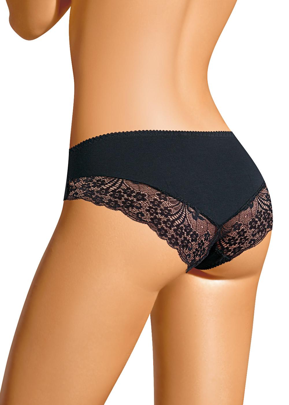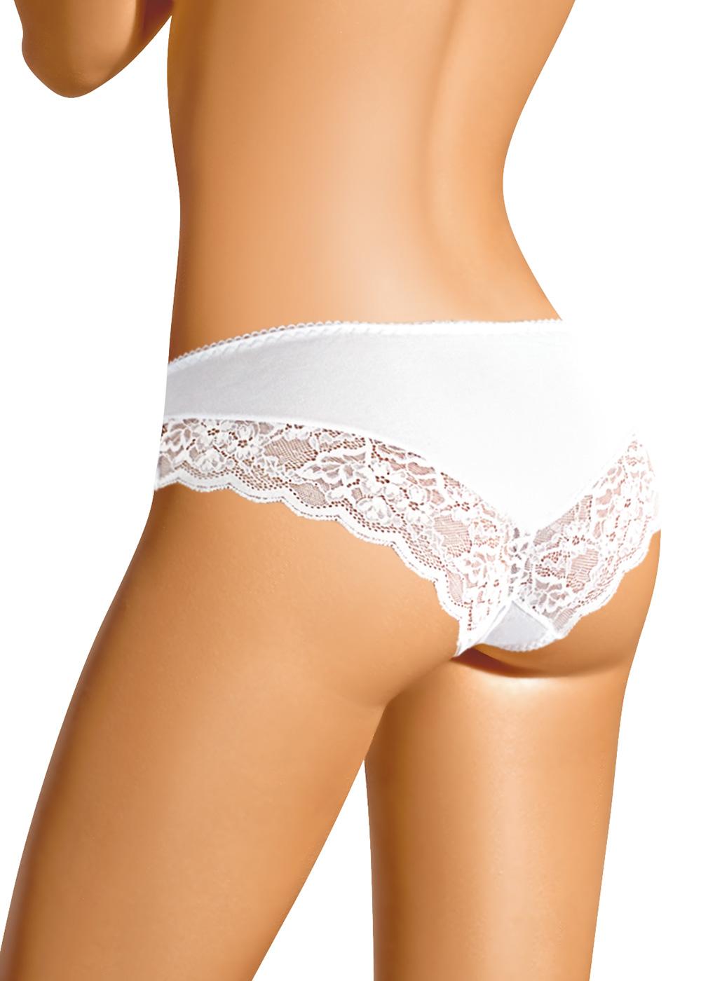 Трусы женские из однотонного полотна, удобной посадки. По ножкам переда и по поясу выполнен фестон. Задняя часть обработана широкими кружевными вставками по ножкам. Завершает дизайн атласный бантик.