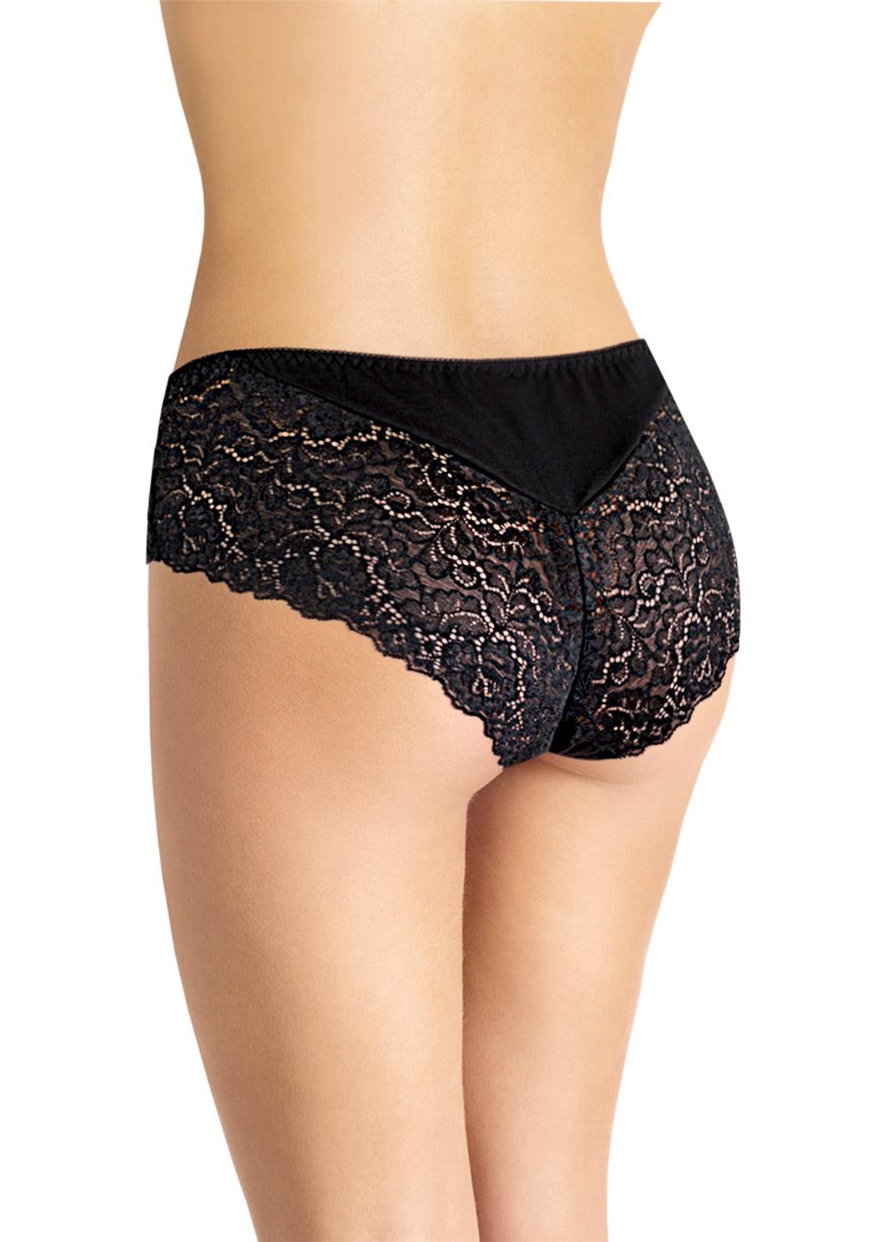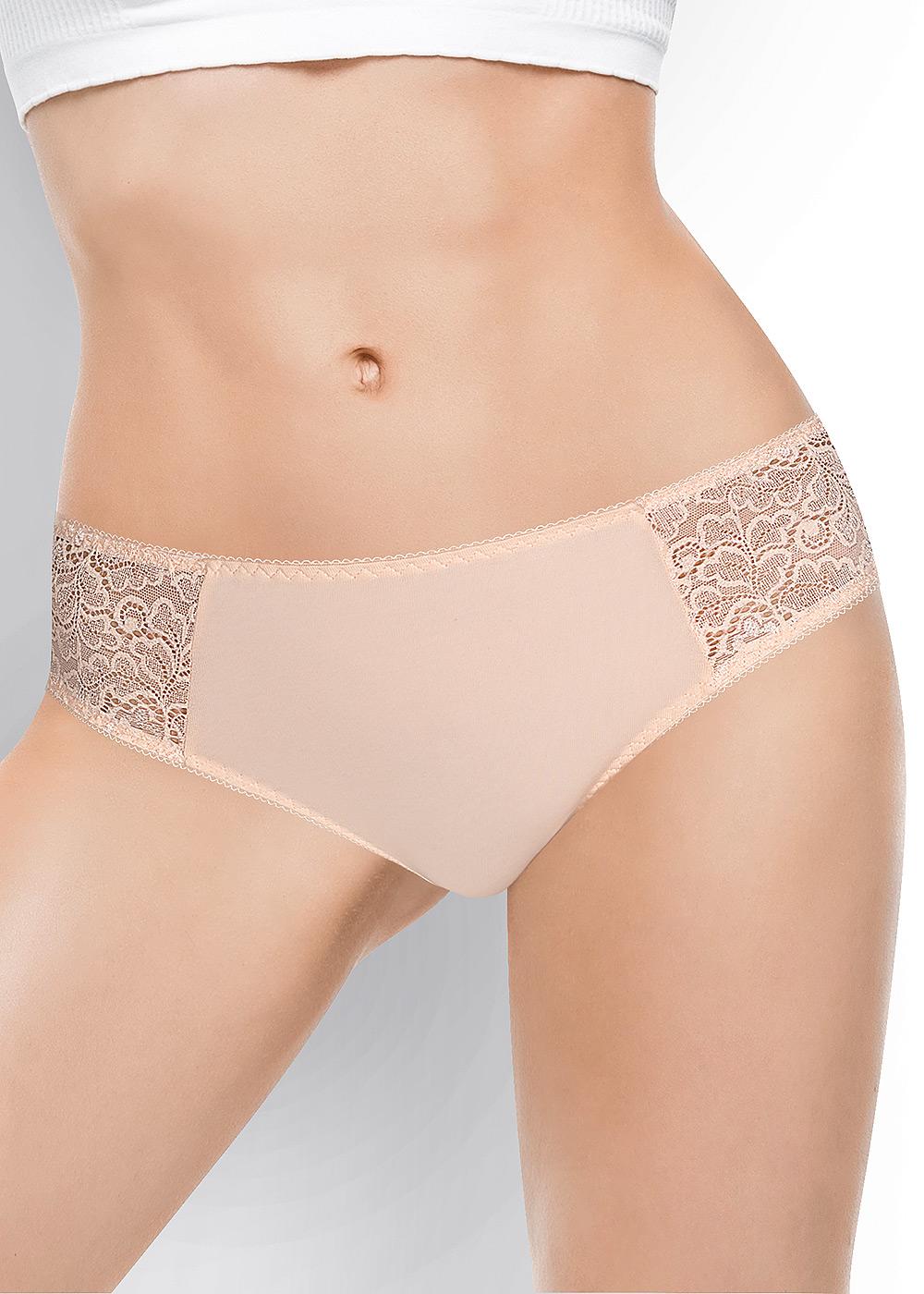 Классическая модель комфортной посадки.Изделие комбинированное: по спинке - кружевное полотно с треугольной трикотажной вставкой,по переду - однотонный трикотаж. Боковой шов в изделии переведен вперед. По ножкам спереди и по талии - резинка с фестоном. На детали переда в центре расположен небольшой атласный бант.