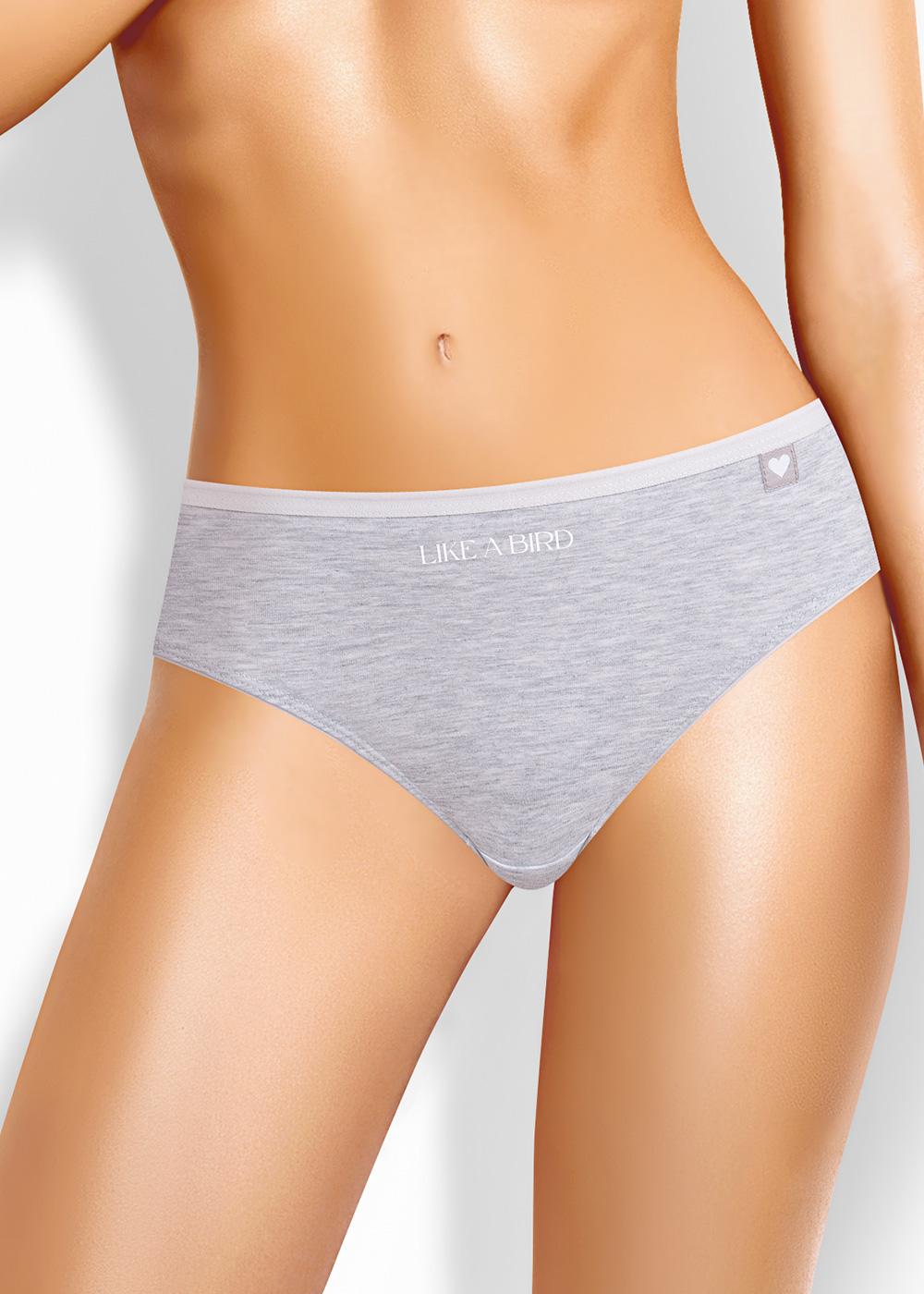 Трусы слипы женские из эластичного меланжевого хлопкового полотна.Обработка краев по талии и ножке - окантовочная резинка. По переду нашивка и принт.