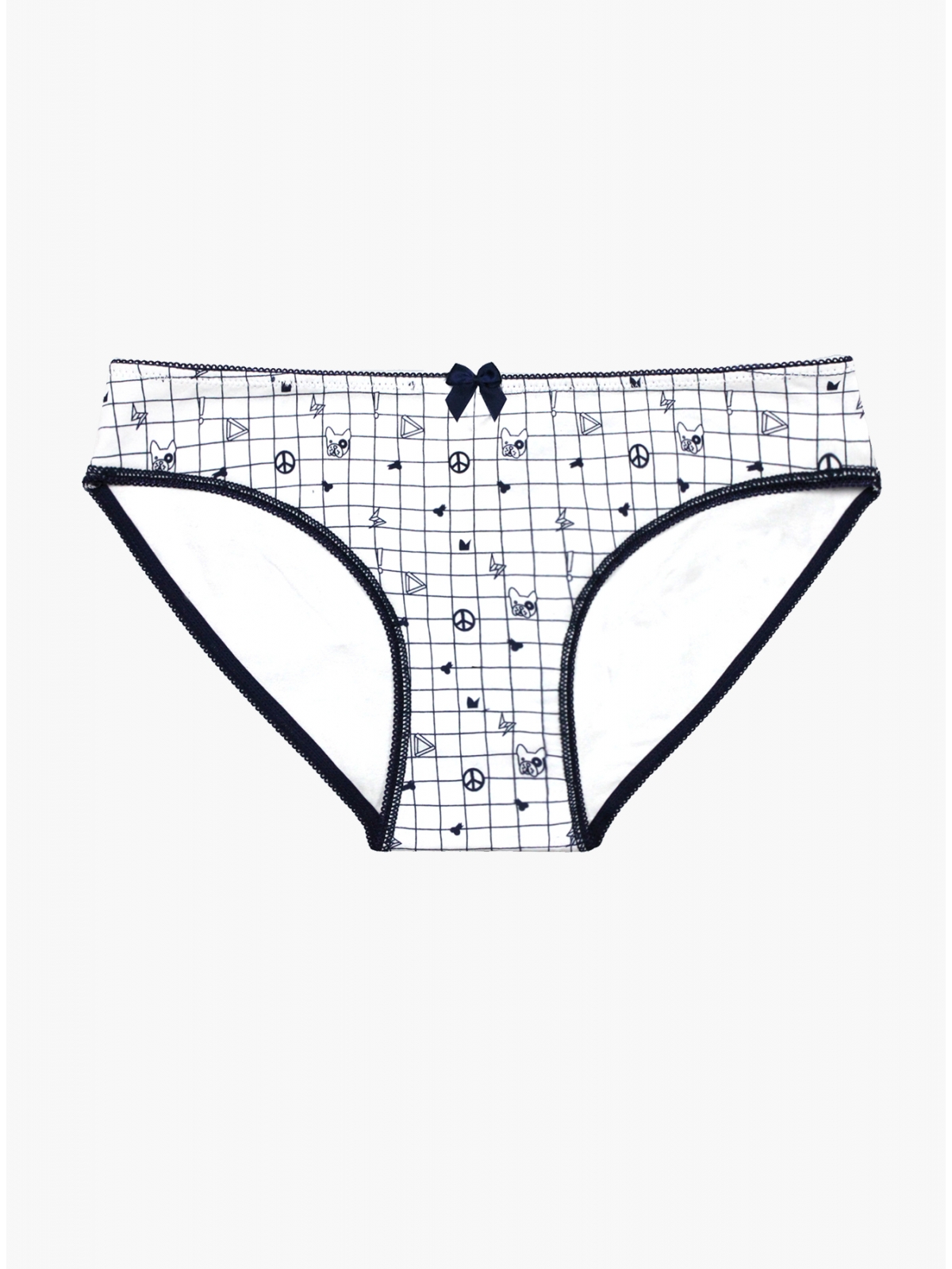 Трусы-слипы из хлопка, белого цвета в клетку с принтом, с кружевным обрамлением по краям, на мягкой резинке.
