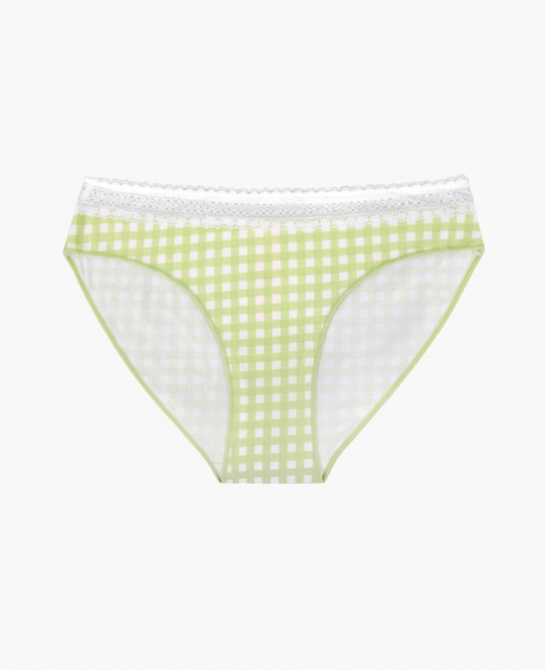 Женские трусы от торговой марки Индефини. Трусы-слипы из хлопка, бело-зеленого цвета, с принтом в клетку, с принтом сзади, с кружевным обрамлением, на мягкой резинке, средней посадки.