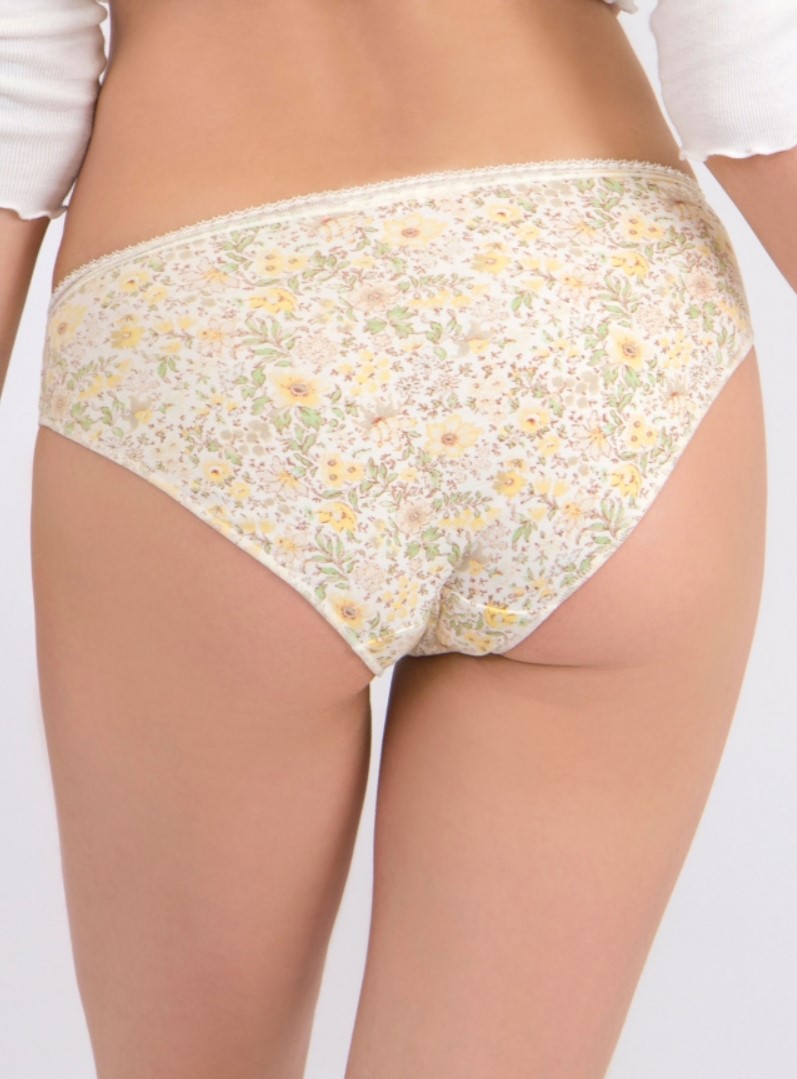 Женские трусы от торговой марки Индефини. Трусы-слипы из хлопка, желтого цвета, с цветочным принтом, с кружевным обрамлением, на мягкой резинке, средней посадки.