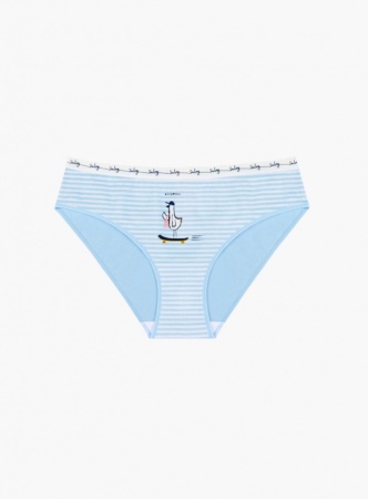 Женские трусы от торговой марки Индефини. Трусы-слипы из хлопка, голубого цвета, с принтом, с надписями, в полоску, на мягкой резинке, средней посадки.