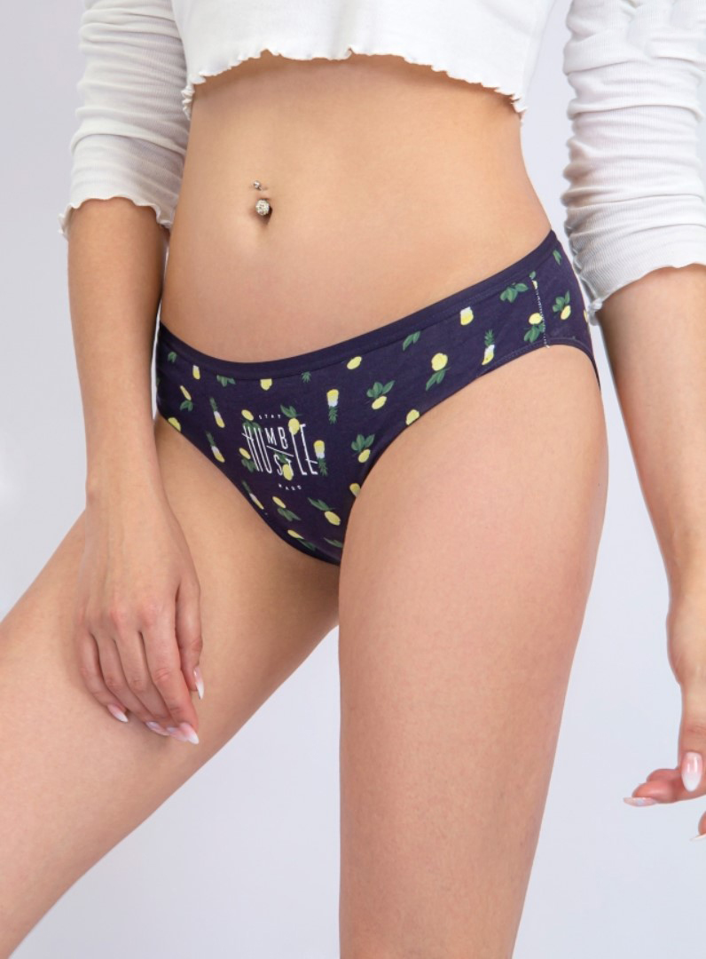 Женские трусы от торговой марки Индефини. Трусы-слипы из хлопка, синего цвета, с цветочным принтом, с принтом-надписями, на мягкой резинке, средней посадки.