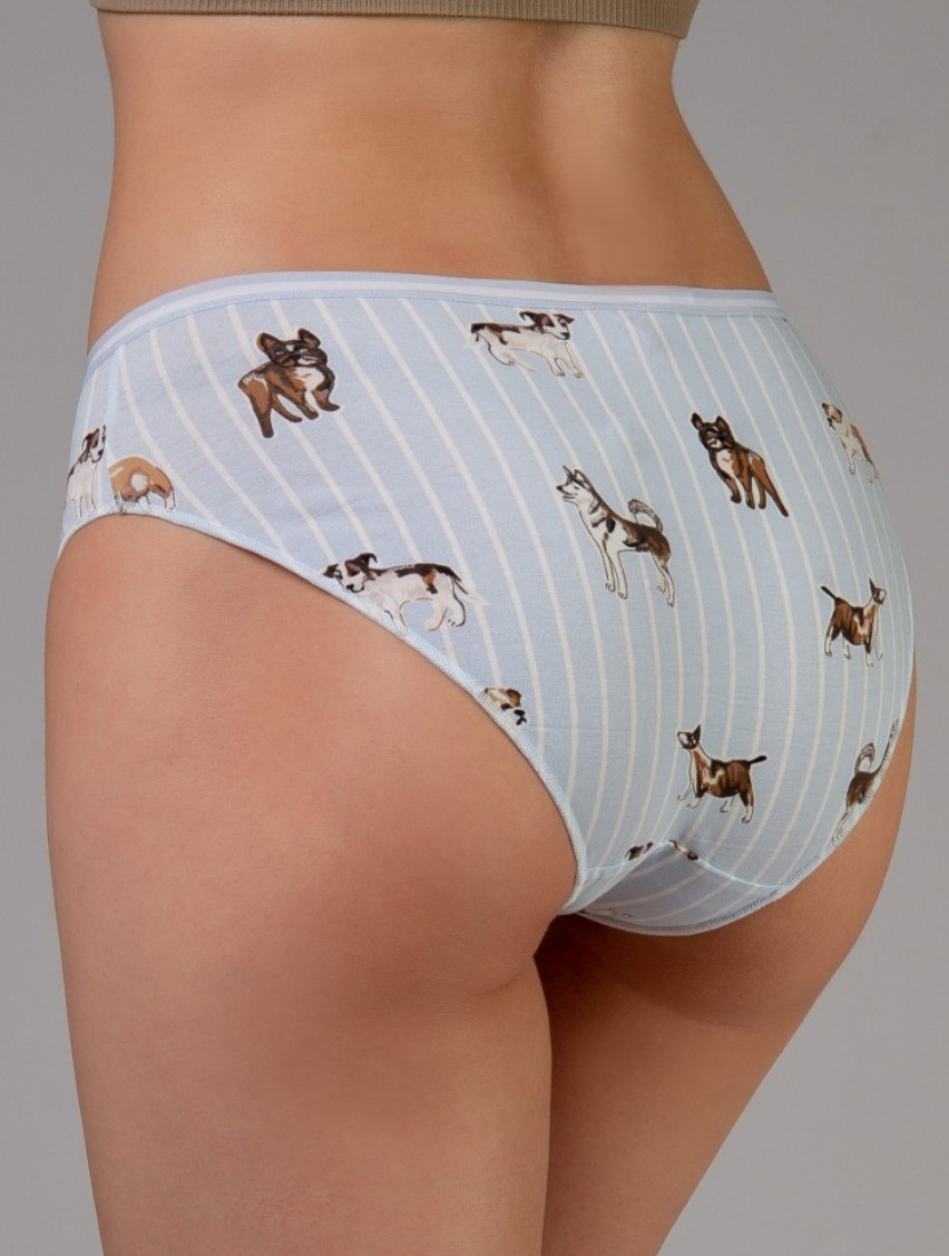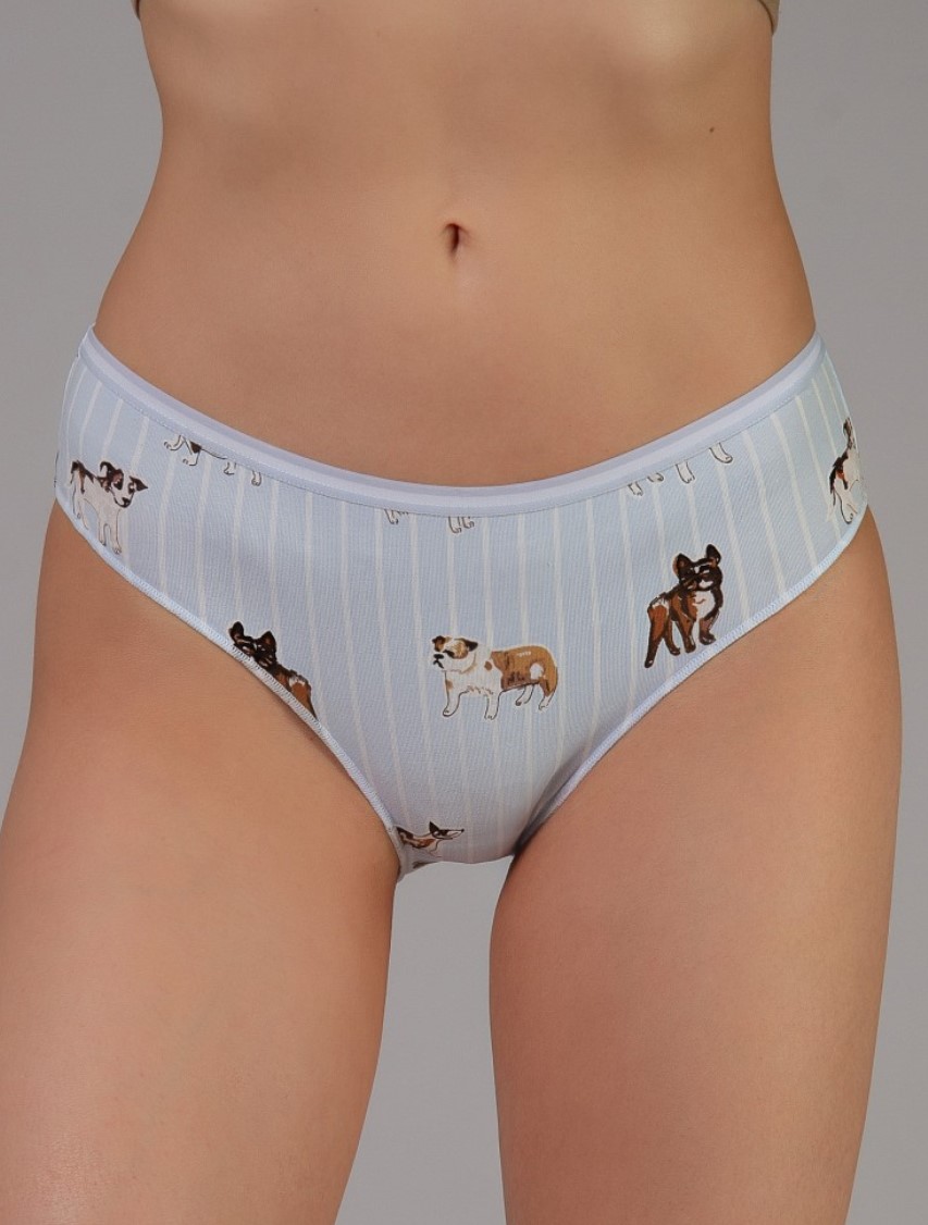 Женские трусы от торговой марки Индефини. Трусы-слипы из хлопка, голубого цвета, с принтом, в полоску, с кружевным обрамлением, на мягкой резинке, средней посадки.