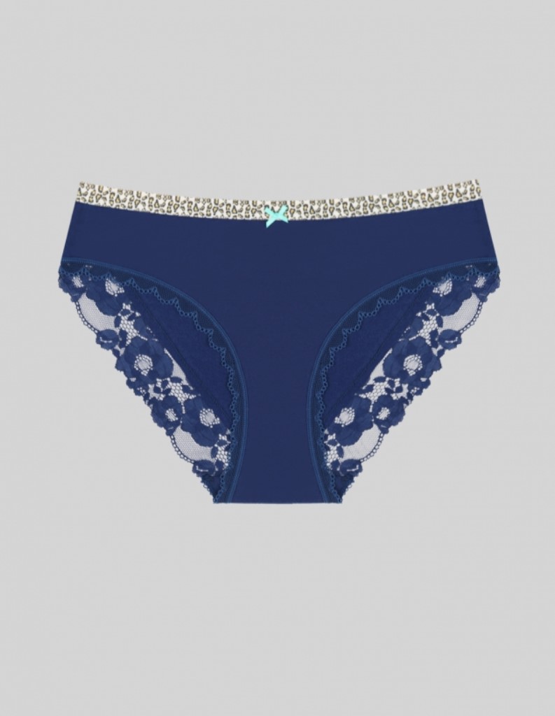 Женские трусы от торговой марки Индефини. Трусы-слипы из хлопка, синего цвета, с кружевными вставками и обрамлением, с принтом на резинке, средней посадки, на мягкой резинке.