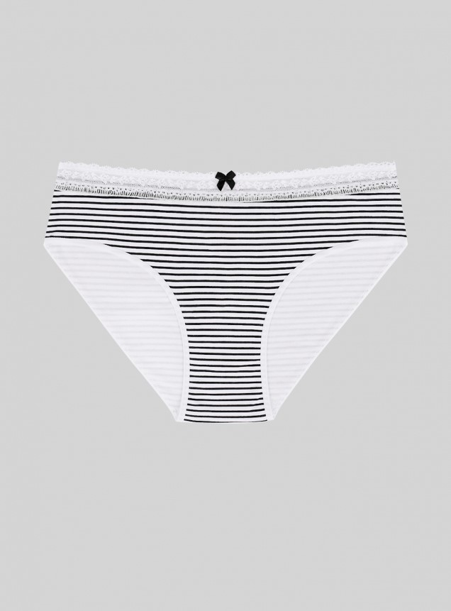 Женские трусы от торговой марки Индефини. Трусы-слипы из хлопка, черно-белого цвета, с принтом в полоску, с кружевным обрамлением, на мягкой резинке, средней посадки.