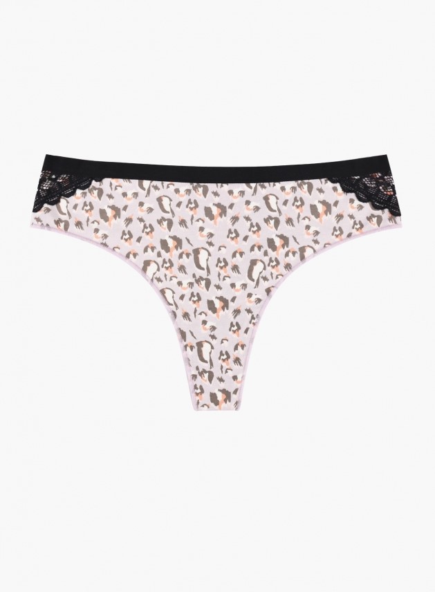 Женские трусы от торговой марки Индефини. Трусы-стринги из хлопка, сиреневого цвета, с анималистичным принтом, с кружевными вставками и обрамлением, средней посадки, на мягкой резинке.
