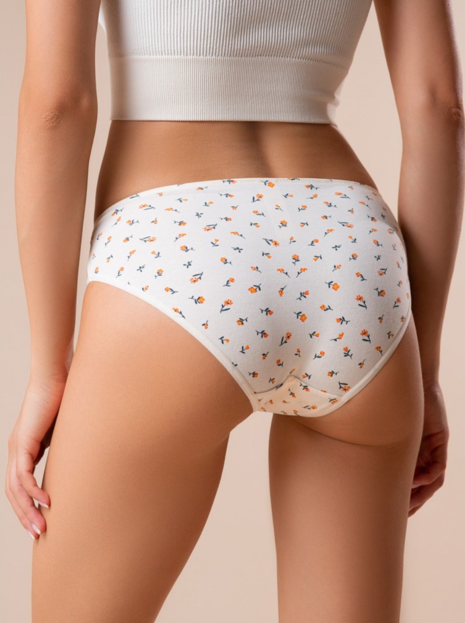 Трусы-слипы, молочного цвета, с цветочным принтом, на мягкой кружевной резинке.