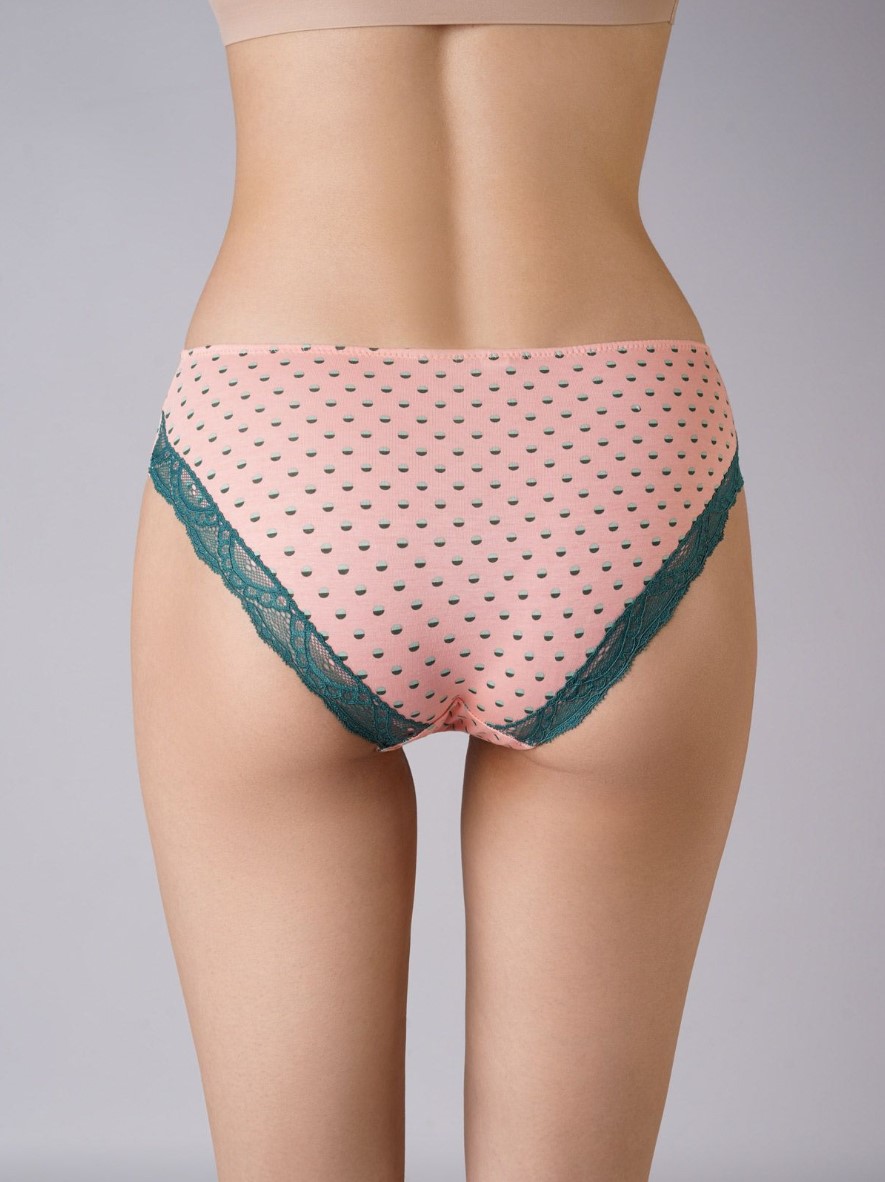 Трусы-слипы в горошек, изготовленные из бамбука и хлопка, мягкие на ощупь и приятно ощущаются на коже. Средняя посадка обеспечивает комфортную поддержку и свободу движений. Мягкая эластичная резинка обеспечивает надежную посадку без дискомфорта. Обрамление из зеленого кружева сзади добавляет нотку изысканности и шарма.