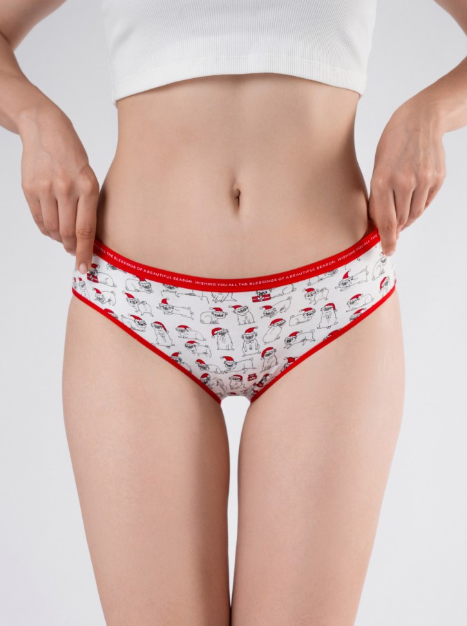 Трусы слипы женские приятные в носке, мягкие и гладкие на ощупь благодаря наличию в составе хлопкового материала. Мягкая резинка на талии надежно фиксирует трусы на теле, что не позволит им сползать при использовании. Принт с изображением новогодних щенков добавляет игривую нотку и создаёт праздничное настроение, делая трусы комфортным и стильным элементом бельевого гардероба. Трусы слипы — удачное сочетание уюта, качества и новогоднего настроения, которое радует в любой зимний день.