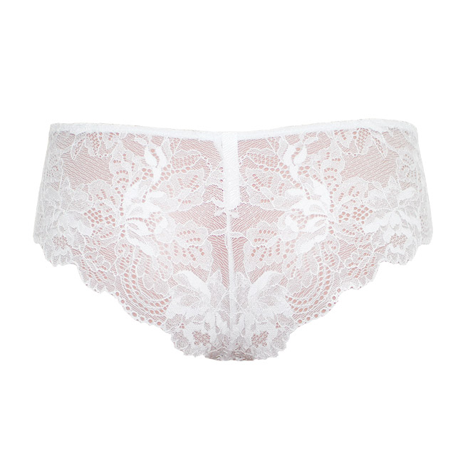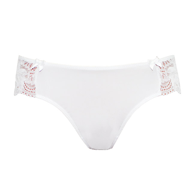 Женские трусы, модель слипы из эластичного мягкого кружева с цветочным орнаментом и гладкого полотна белого цвета. Трусы средней посадки по фигуре, с широким кружевным боком. На поясе узкая резинка и декоративные бантики. Ластовица из хлопка.