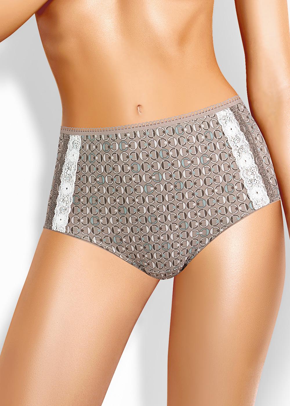 Трусы-макси женские из эластичного хлопкового полотна. Обработка краев по талии - ажурная резинка с фестоном, по ноге - окантовка. По переду отделка двойным кружевом.