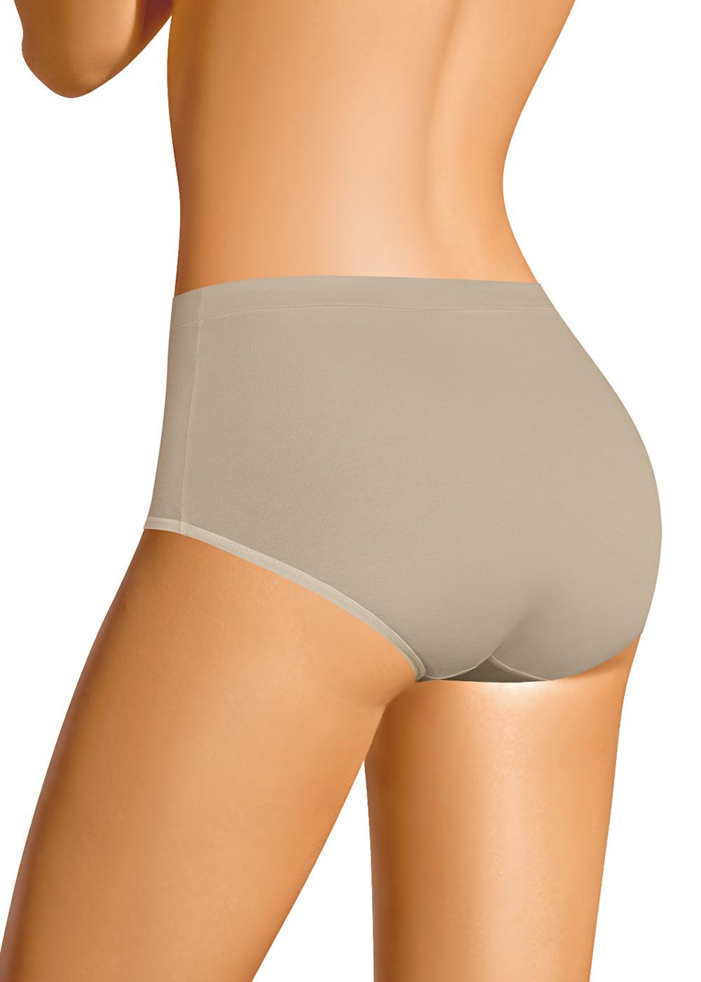 Трусы макси женские из эластичного хлопкового полотна. Обработка краев по талии - обтачка с внутренней резинкой, по ноге - окантовочная резинка. На детали переда вертикальные резы. По талии и по вертикальным резам- обработка "зубы". По переду принт.