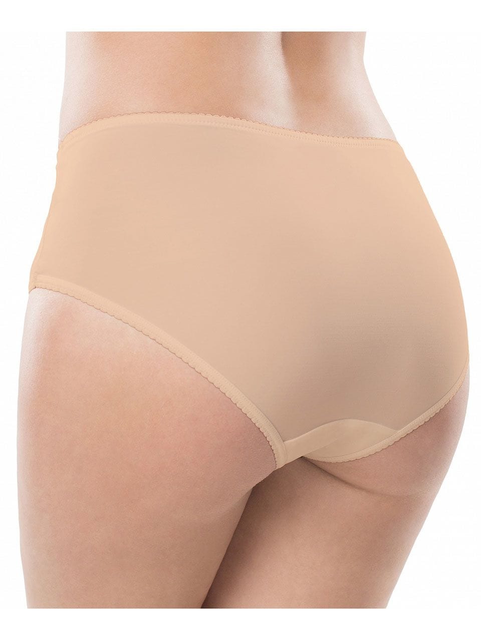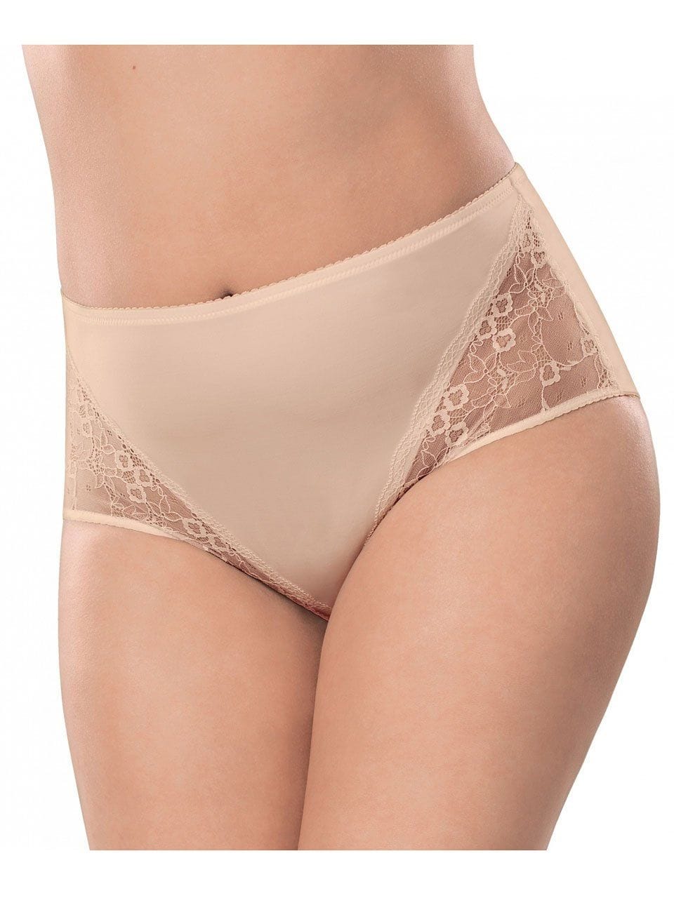 Трусы-слипы из эластичного полотна и эластичного кружева с высокой линией талии. Передняя деталь продублирована подкладкой из эластичной сетки.