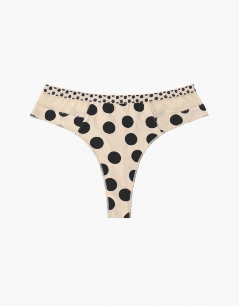 Женские трусы от торговой марки Индефини. Трусы-стринги из бамбука и хлопка, кремового цвета, с принтом в горошек, со вставками из микросетки, на мягкой резинке, средней посадки.