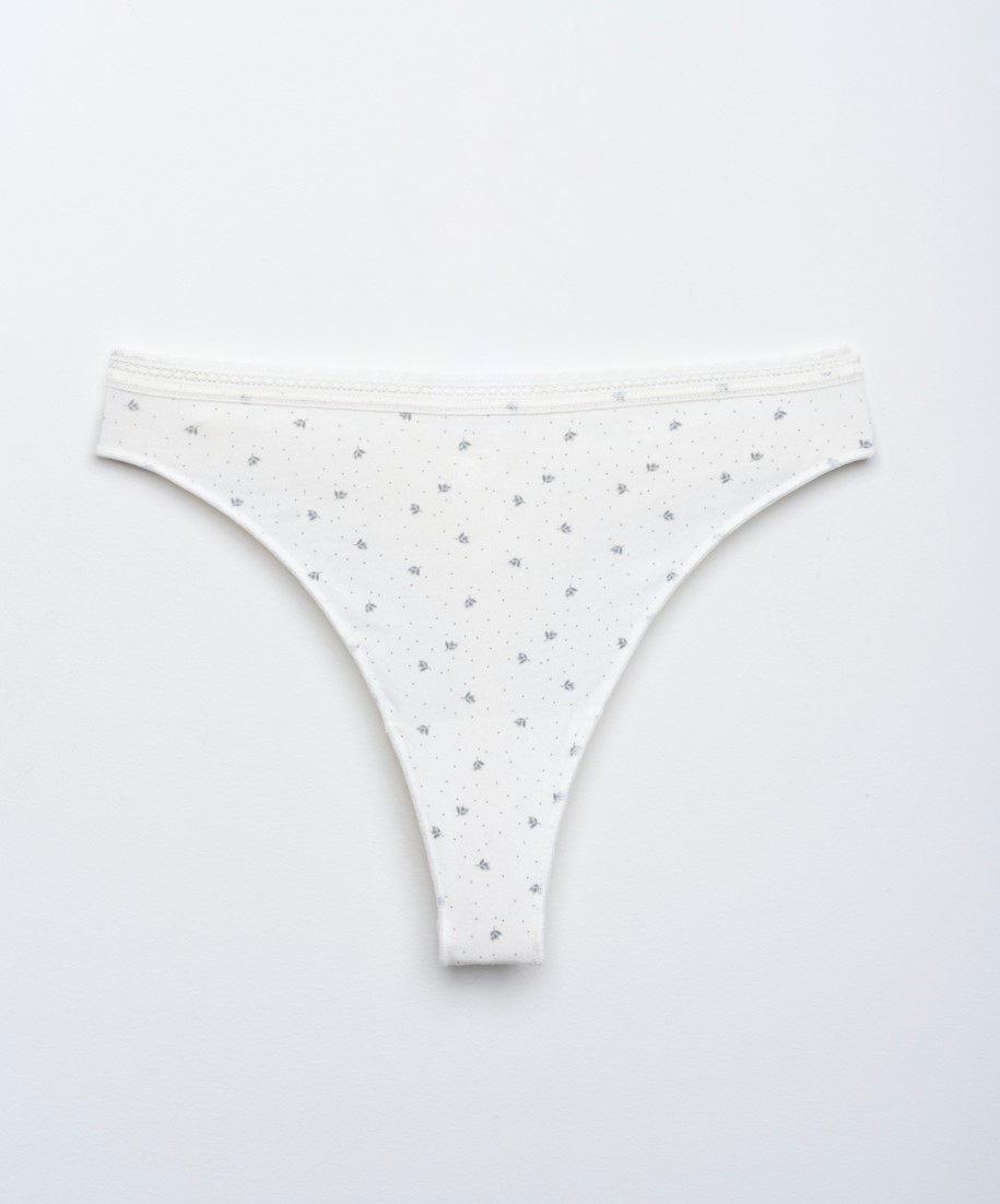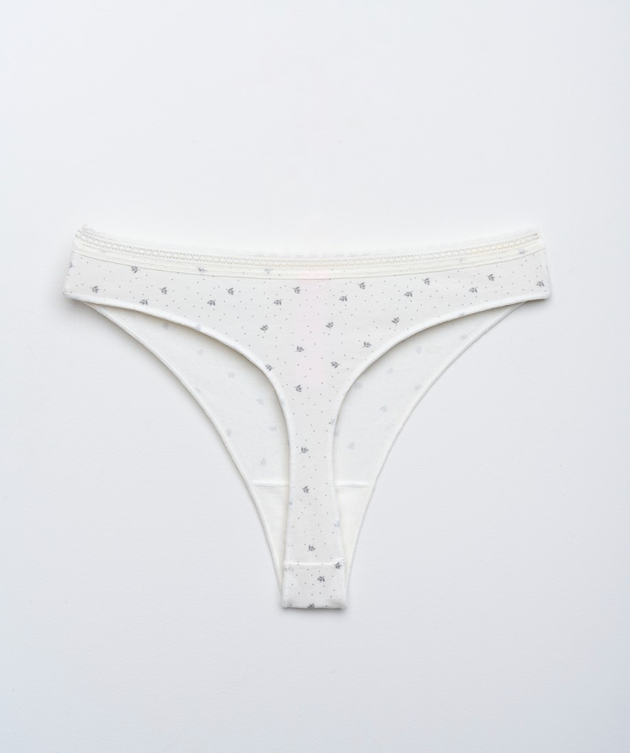 Стринги из мягкого хлопкового трикотажа — прекрасный выбор для ценителей женственного нижнего белья. Кружевная окантовка с фестонами, нежный оттенок белого и акцент на открытых ягодицах придают образу неотразимую притягательность, а небольшое количество эластана в составе делает белье долговечным и эластичным. Мягкая резинка не натирает, материал подходит даже для чувствительной кожи.