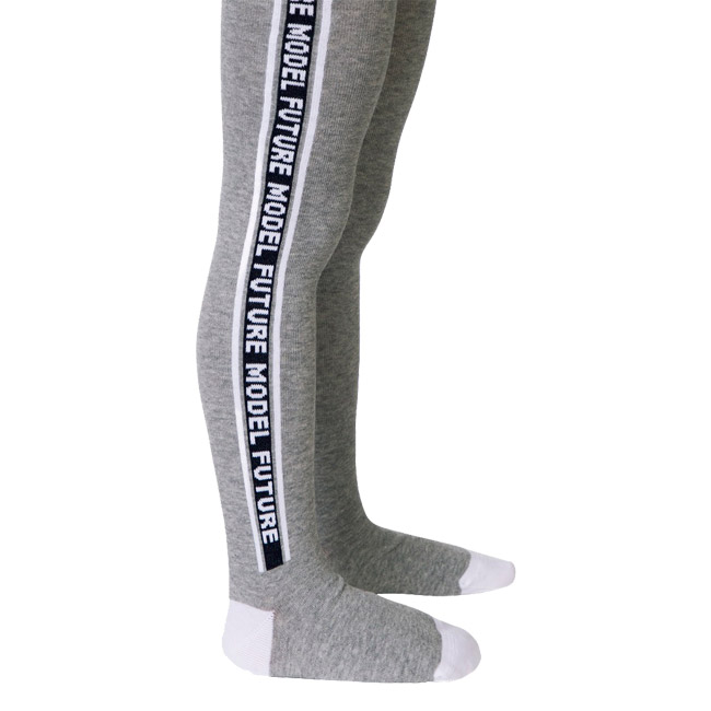Мягкие и практичные детские колготки из хлопка с добавлением эластичных нитей серого цвета. Колготки с рисунком «Лампасы» и надписью Model FUTURE — модель будущего. Носок и пятка белого цвета. На поясе эластичная резинка.