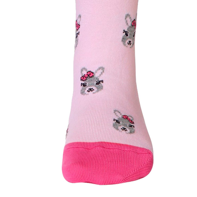 Мягкие и практичные детские колготки из дышащего хлопка с добавлением эластичных нитей, цвет розовой Колготки с мелким рисунком "зайчики". Носок и пятка уплотнены, ярко-розового цвета. На поясе эластичная резинка, есть ластовица.