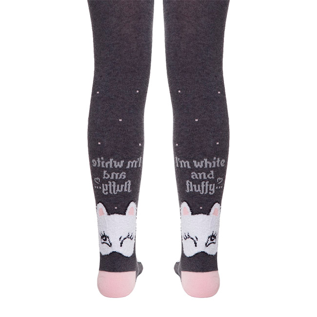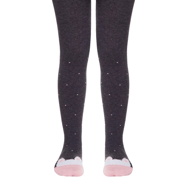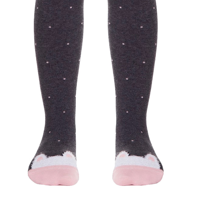 Мягкие и практичные детские колготки из дышащего хлопка с добавлением эластичных нитей, цвет темно-серый. Колготки однотонные, носок оформлен аппликацией с ушками. Пятка уплотнена, розового цвета. На поясе эластичная резинка, есть ластовица.