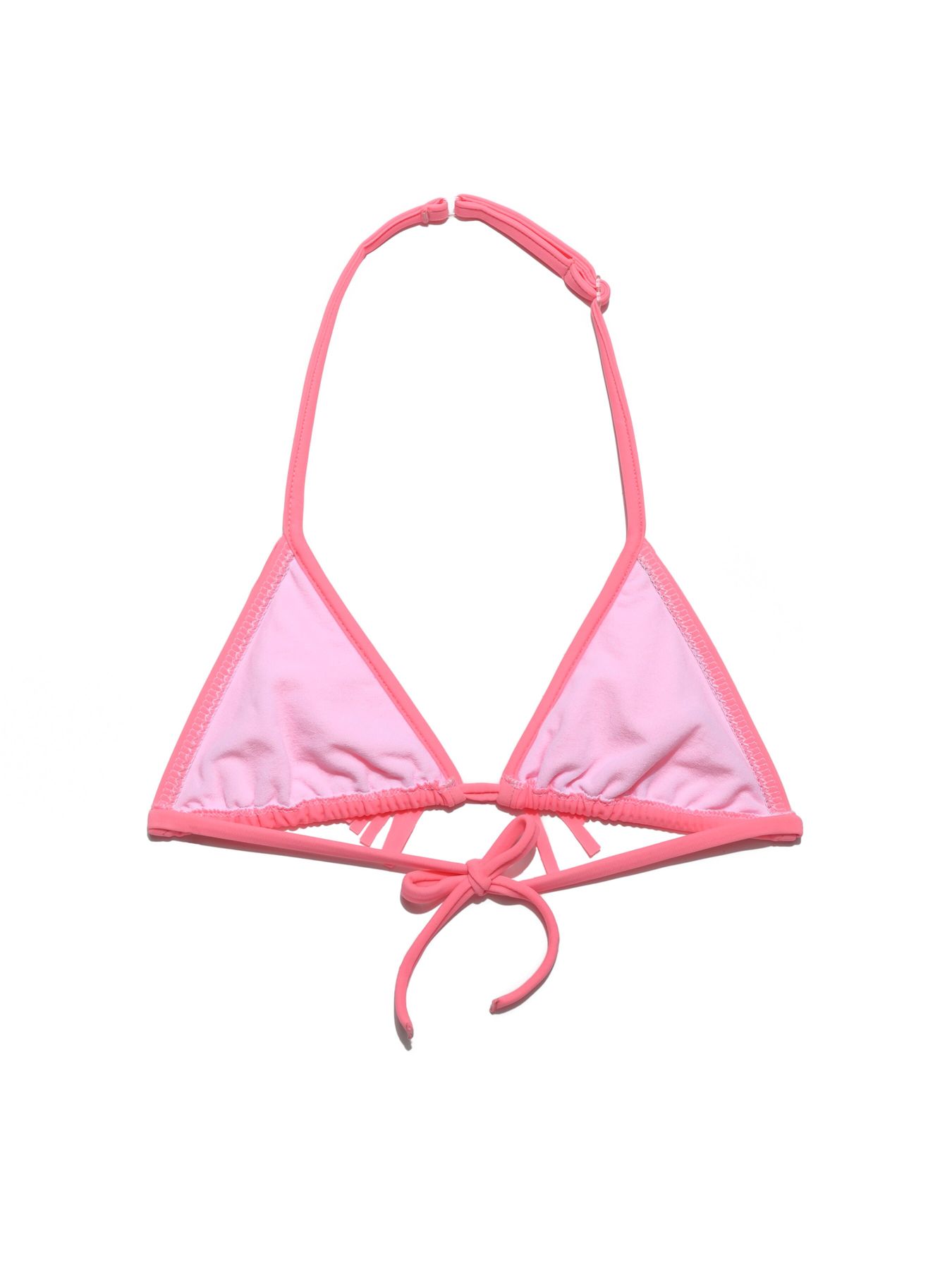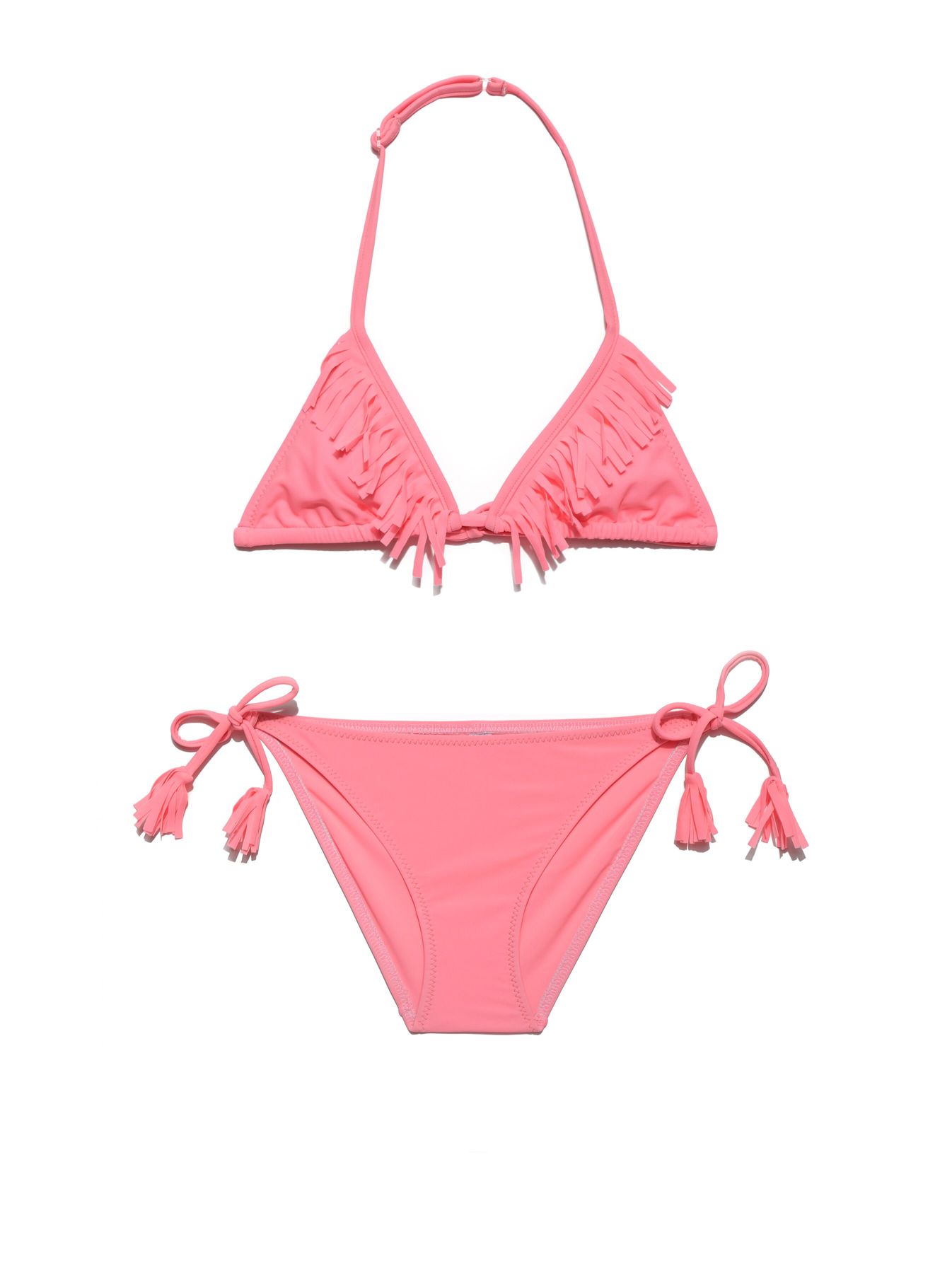 Костюм купальный для девочки из эластичного трикотажного полотна. Лиф мягкие треугольники без внутренней чашки фиксируется регулируемой бретелью за шею и тонкими завязками-спагетти на спине. Трусы купальные с завязками по бокам.