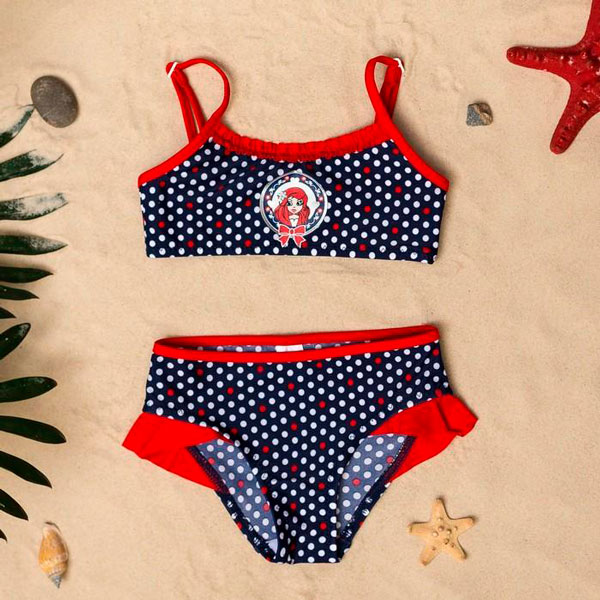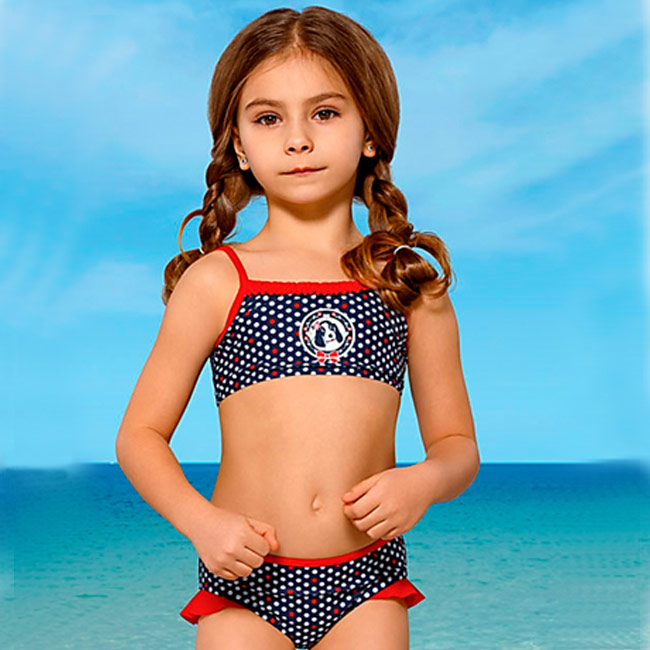 Детский раздельный купальник для девочек из эластичного полотна. Топ из набивного полотна, в горох, декорирован тематическим принтом. Бретели несъемные, регулируются по длине. Плавки из набивного полотна, в горох, декорированы рюшей.