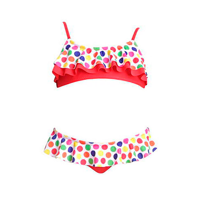 Детский раздельный купальник для девочек из эластичного, набивного полотна в ярких горох. Топ декорирован рюшей. Бретели несъемные, регулируются по длине. Плавки декорированы рюшей в виде юбки.