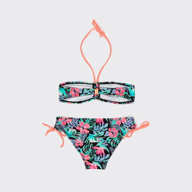 Детский купальник для девочек выполнен из набивного полотна с ярким цветочным акцентом. Купальник раздельный, топ фиксируется завязками на шее и кручками на спине. Классические трусы декорированы завязками по бокам.