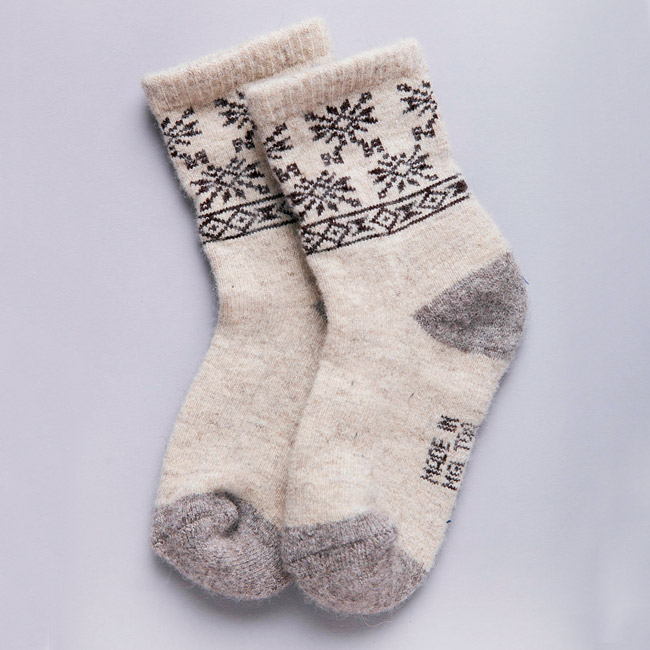 Носки детские из натуральной шерсти. Высококачественные изделия из монгольской шерсти сохранят ножки ребенка в тепле и сухости в любое время года.Цвет бежевый/серый. На голени снежинки.