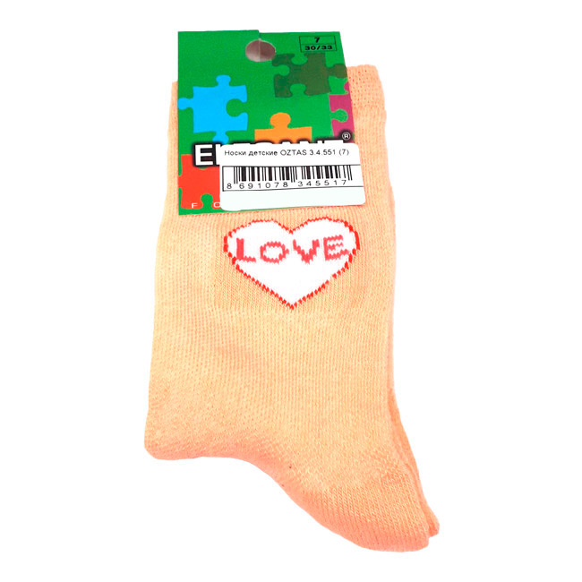 Детские носки для девочек выполнены из эластичного мягкого полотна с добавлением хлопка. Носки полностью однотонные, персикового цвета на голени изображено сердечко с надписью "любовь". Комфортная резинка на голени.